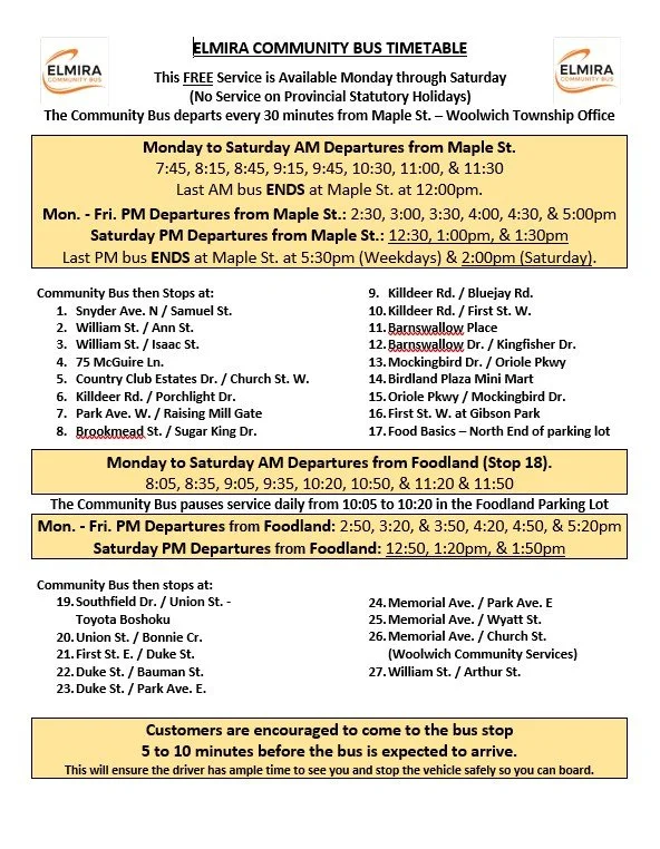 This PILOT PROJECT bus services various stops around Elmira. Look for the orange bus stop sign at the various bus stop locations. Customers are encouraged to come to the bus stop 5 to 10 minutes before the bus is expected to arrive. This will ensure the driver has ample time to see you and stop the vehicle so you can board.